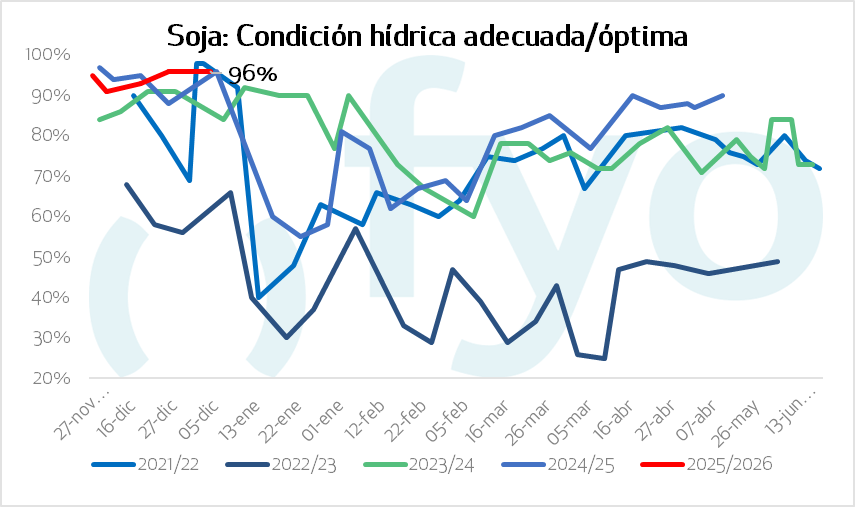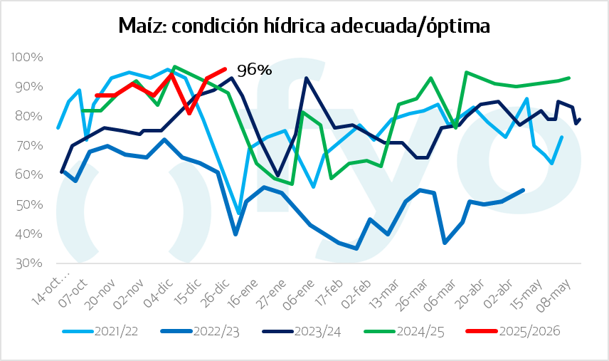 - El 85,1 % del área en pie presenta una condición hídrica Óptima/Adecuada, registrando importantes mejoras por las recientes lluvias.