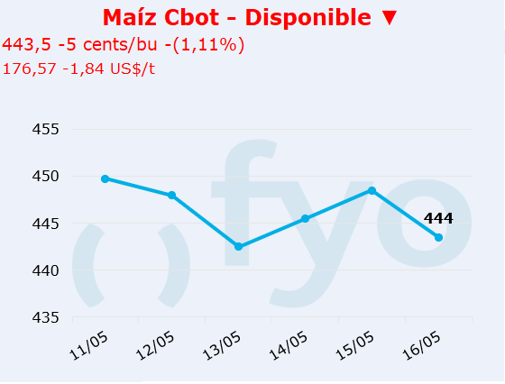 - Los futuros de maíz concluyen la jornada en baja, con el contrato de mayor volumen operado acercándose al mínimo desde diciembre del año pasado.