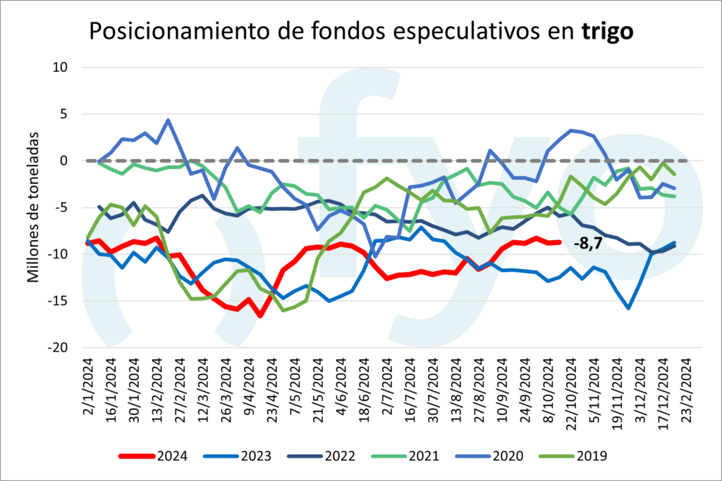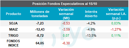 Dichos fondos detuvieron las compras netas de productos agrícolas durante casi dos meses. En soja, la variación fue poco significativa, con ventas por 500.000 toneladas. En cuanto al maíz, incrementaron su posición vendedora en el equivalente a 3,6 Mt. En trigo, prácticamente se mantuvieron sin cambios.
