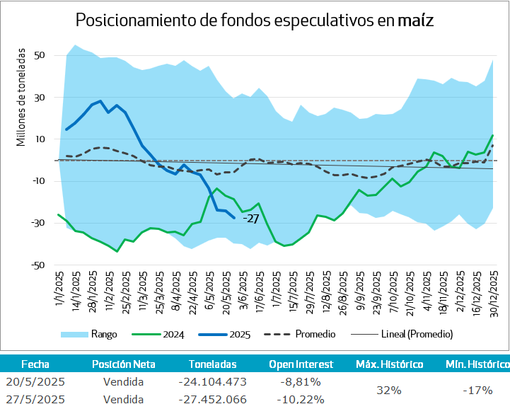 En el caso de la soja, se registraron compras por 2,3 millones de toneladas, lo que ubica la posición de estos fondos en terreno neutro para la soja. En cuanto al maíz, se alcanzó la sexta semana consecutiva de ventas netas, acumulando 25,3 millones de toneladas en dicho período. Para el trigo, la variación en el posicionamiento fue de bajo volumen.