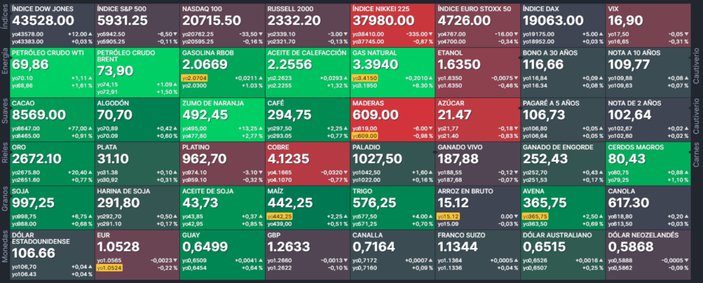 Energía petrólo WTI, gas oil con ultra bajo contenido de azufe (ULSD), nafta, gas natural, petróleo Brent y etanol.