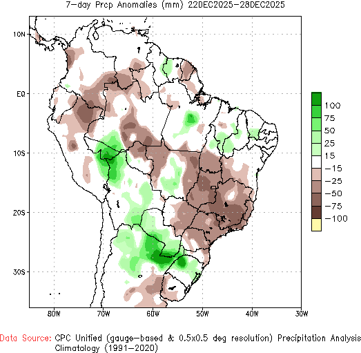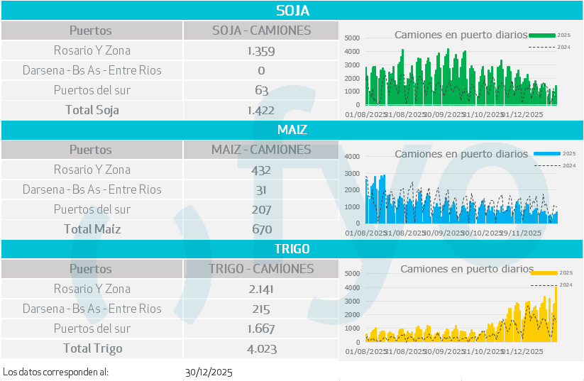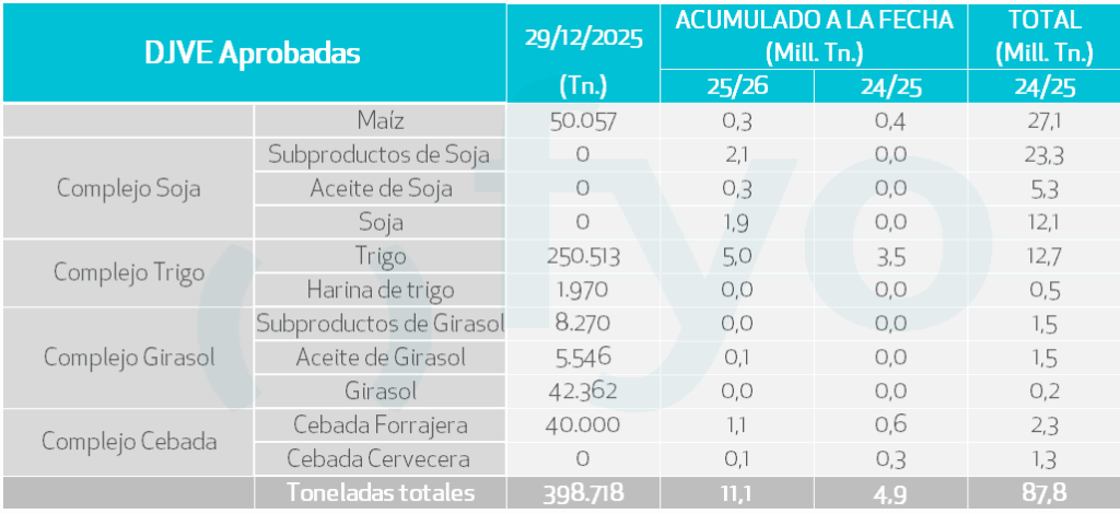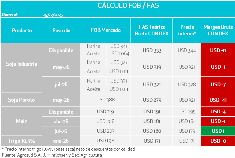 - La buena demanda que está encontrando el cereal de EE.UU. opera de soporte: Los datos de Inspecciones de Exportación de ayer mostraron que los envíos de maíz alcanzaron los 1,3 Mt durante la semana que terminó en Navidad. Esto representó una disminución del 25,53 % con respecto a la semana anterior, lo cual es normal debido a la festividad, pero un aumento del 43,37 % con respecto a la misma semana del año pasado y en la parte superior de las estimaciones de analistas.