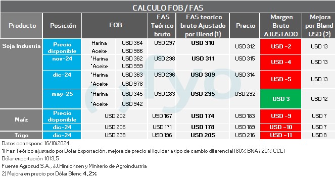 En el caso de la posición fábrica se parte de los precios FOB de los subproductos, luego se les aplica al valor del aceite, el porcentaje de rendimiento del poroto de soja para la extracción del mismo, y lo mismo en harina. Se suman estos valores, y se descuenta el costo de molienda estimado. El resultante es la capacidad teórica de la fábrica.