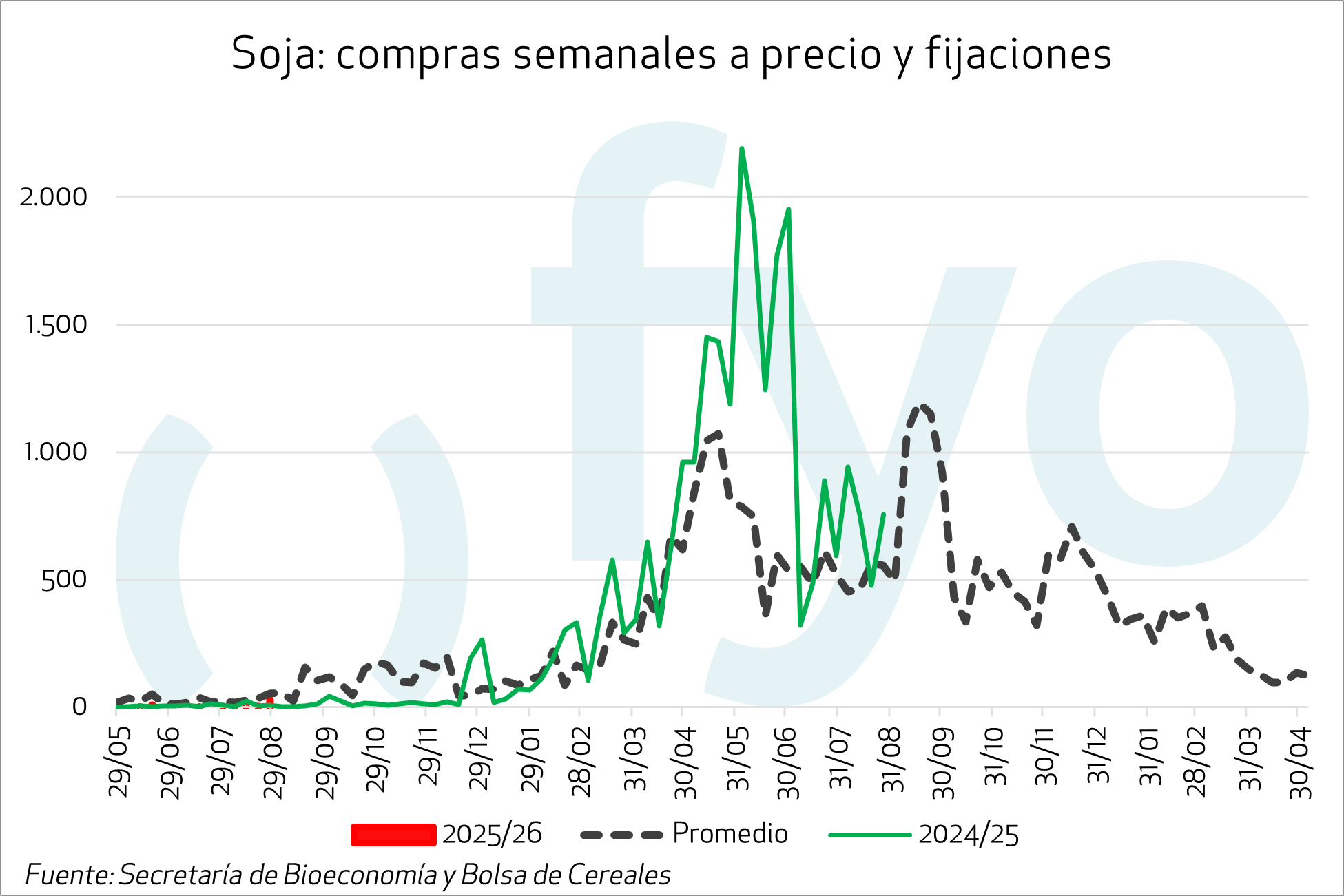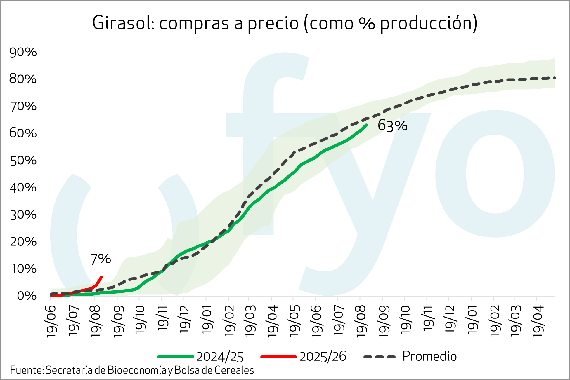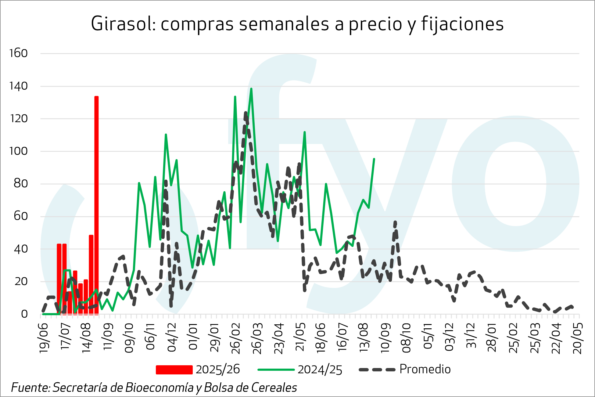 Durante la última semana, se registró un buen volumen de negocios para las oleaginosas. En el caso de la soja, se concretaron compras por 757.000 toneladas a precio y fijaciones, por encima de los promedios. De esta forma, la soja con precio representa el 51% de la producción, 10 puntos porcentuales por encima del promedio de los últimos cinco años. En cuanto al girasol, también se observó un buen volumen de negocios a precio, con casi 100.000 toneladas de girasol viejo y 133.000 toneladas de girasol de la nueva campaña.