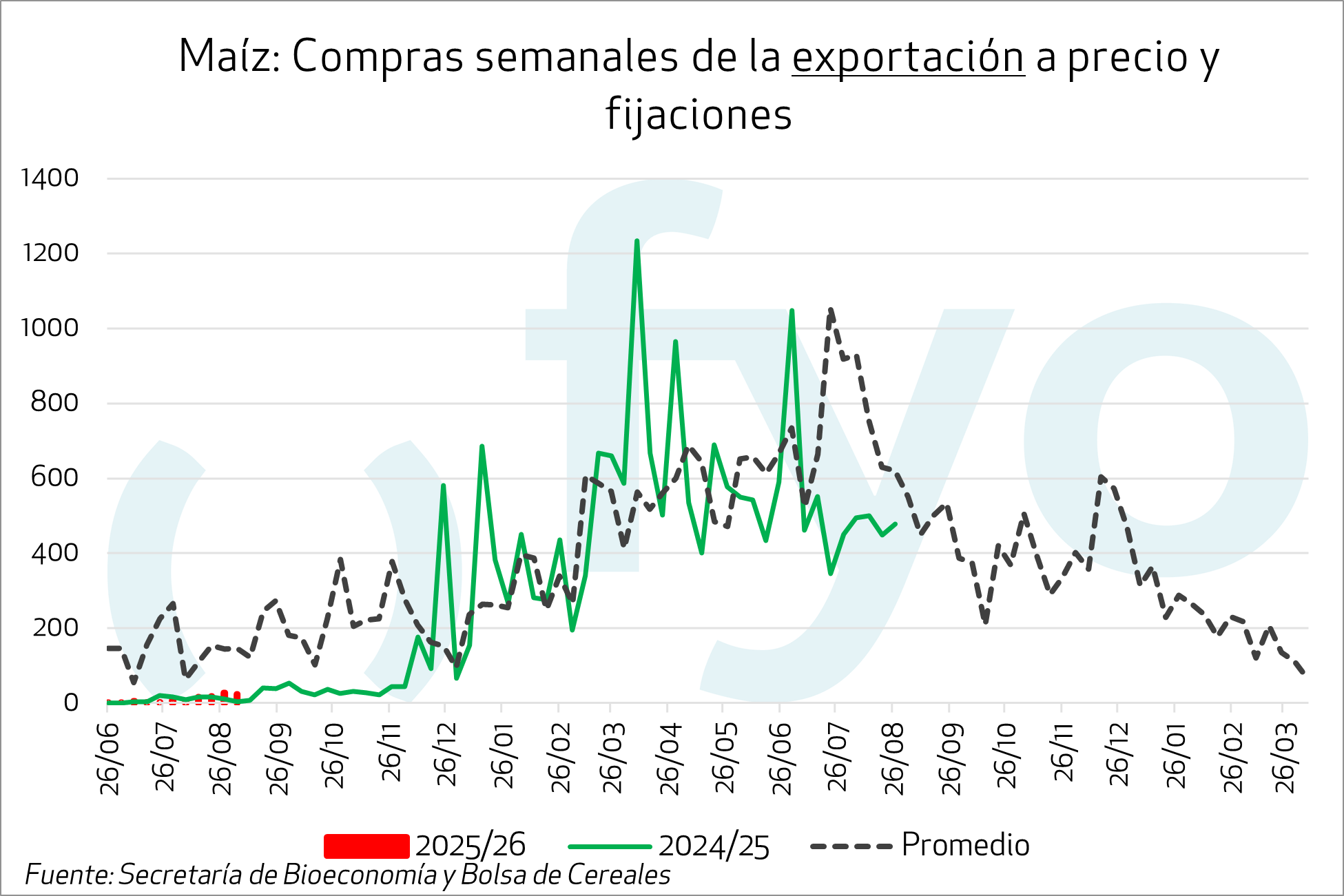 Por otro lado, los negocios semanales de maíz siguen por debajo de los promedios, con solo el 44% de la mercadería a precio, por debajo del promedio del 52% para esta altura de la campaña.