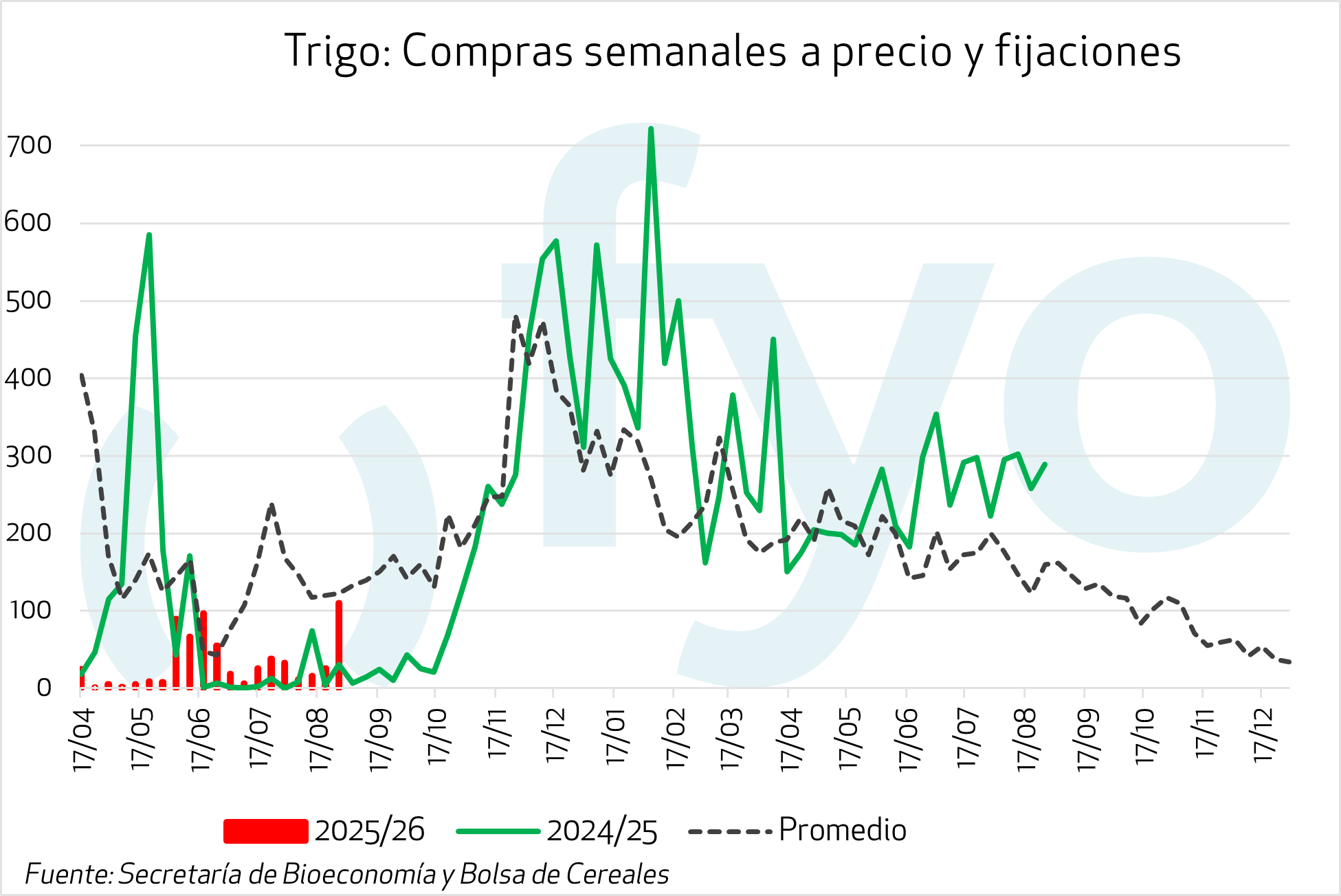 Finalmente, en lo que respecta al trigo, los negocios de trigo viejo muestran un dinamismo superior al de años anteriores, con operaciones a precio por 289.000 toneladas. Mientras tanto, el trigo nuevo ya supera los 110.000 toneladas en negocios semanales.