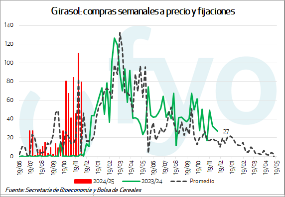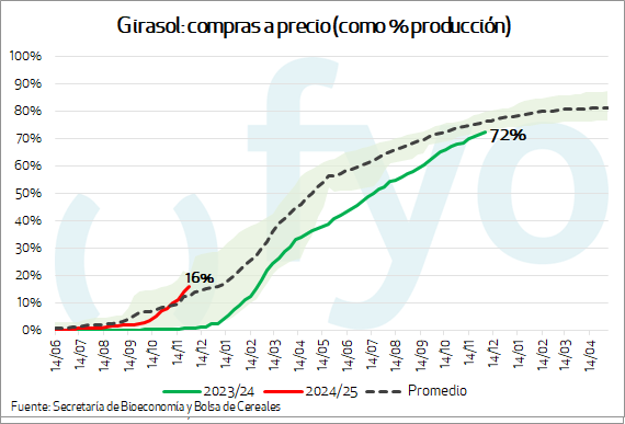 Por último, los negocios de girasol continúan a buen ritmo. Se le puso precio a unas 80.000 tt., y el volumen negociado con precio ya alcanza al 16% de la campaña, superando el promedio para la fecha que ronda el 13%.