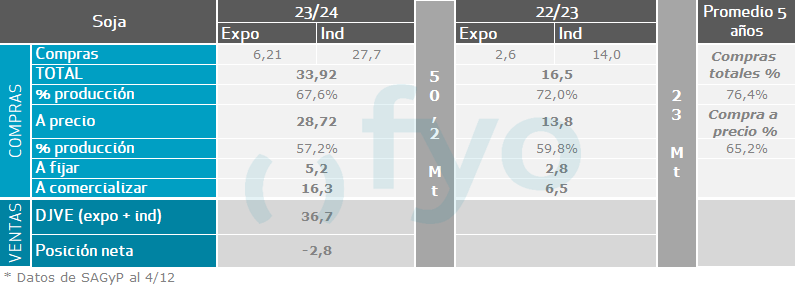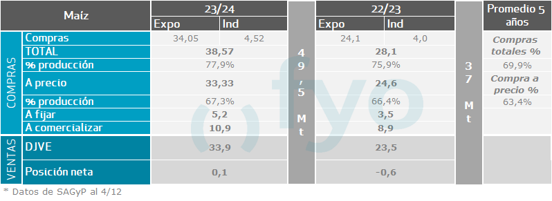 En cuanto a la campaña gruesa los negocios también mostraron un repunte, aunque para la campaña vieja. Se le puso precio a unas 787.000 tt. de maíz, unas 350.000 tt. más que la semana previa y casi el doble de los promedios para la fecha. Para la soja de la campaña 2023/24 también los negocios mostraron un incremento. Se le puso precio a unas 738.000 tt. de soja, acercándose a los promedios. En cuanto a los negocios de la nueva campaña de soja y maíz, mostraron una leve caída, y la comercialización aún avanza lento en ambos casos.