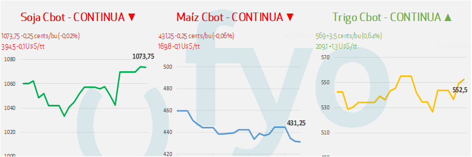 Granos maíz, trigo, soja, harina de soja, aceite de soja, cebada, arroz, trigo y canola.