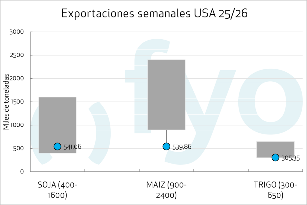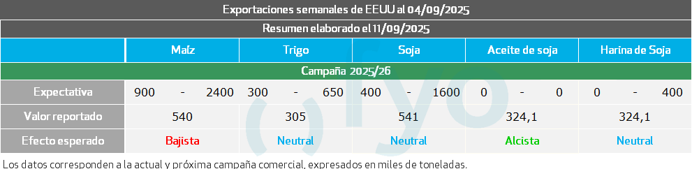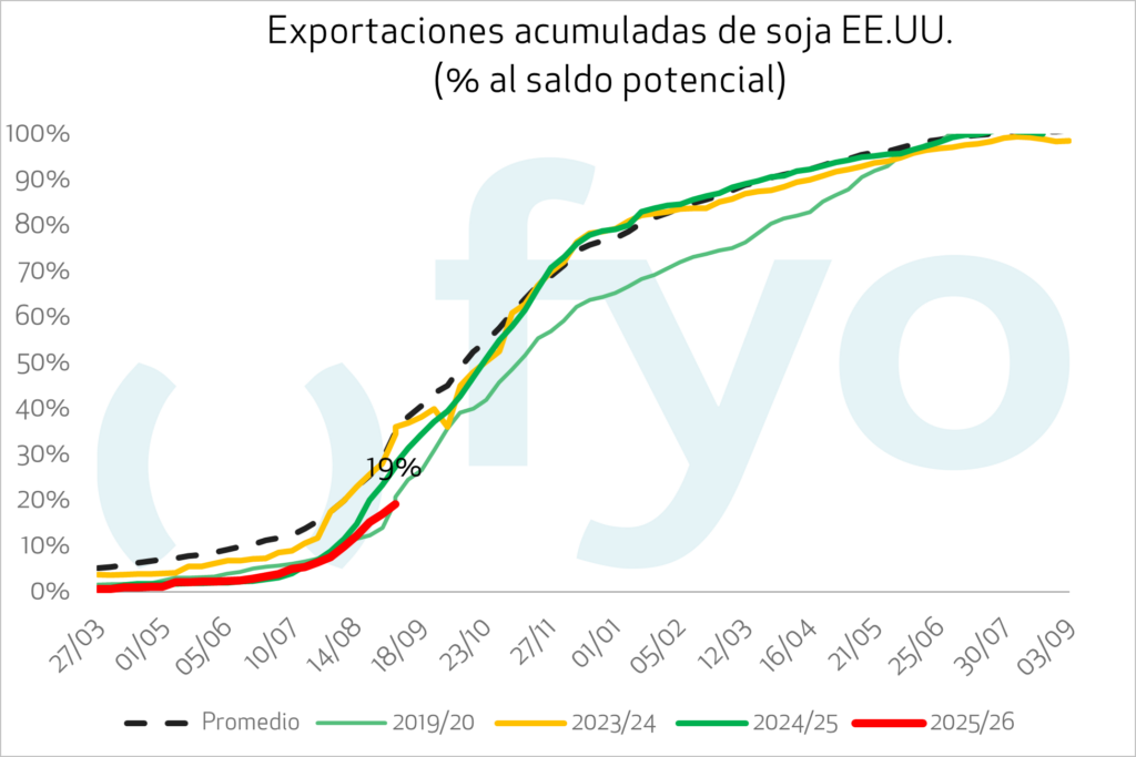 Las ventas semanales de exportación de soja de Estados Unidos para la nueva campaña 2025/26 se registraron en 541.000 toneladas, ubicándose en el rango inferior de las expectativas del mercado (400.000 a 1.600.000 toneladas). Los compromisos totales de venta para la nueva campaña se sitúan en 9.361.162 toneladas. Este volumen es inferior a las 14.233.707 toneladas registradas en la misma fecha del año anterior y representa el nivel más bajo en 17 años para el inicio de una campaña. Las ventas fueron lideradas por destinos desconocidos con 432.000 toneladas, y China aún no ha registrado compras para esta campaña.