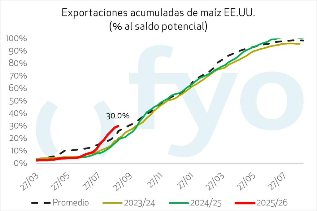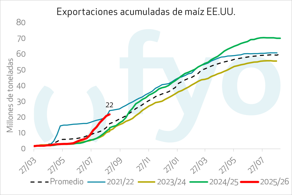 Las ventas semanales de exportación de maíz, correspondientes a la primera semana de la campaña comercial 2025/26, totalizaron 540.000 toneladas. El dato se ubicó por debajo de las expectativas del mercado, que oscilaban entre 900.000 y 2.400.000 toneladas. A pesar de la cifra semanal, los compromisos totales de venta para la nueva campaña ascienden a 22.606.000 toneladas. Este volumen supera las 13.360.400 toneladas comprometidas en la misma fecha de 2024 y constituye el segundo registro más alto en la historia para un inicio de campaña, solo por detrás del ciclo 2021/22. Los principales compradores de la semana fueron México (255.000 toneladas), Japón (104.000 toneladas) y Vietnam (94.000 toneladas).