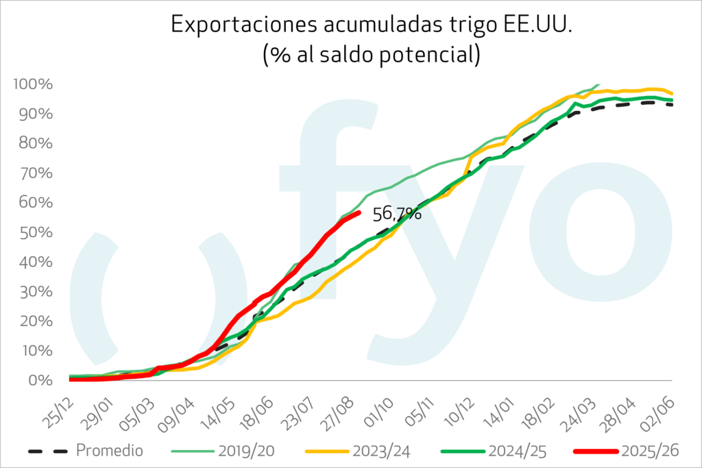 Las ventas de exportación de trigo de la semana fueron de 305.000 toneladas, situándose en el extremo inferior del rango esperado por los operadores (300.000 a 650.000 toneladas). El volumen es similar al de la semana previa y muestra una desaceleración, con un promedio de ventas en las últimas cuatro semanas de 429.905 toneladas, inferior a las 691.274 toneladas del período de cuatro semanas anterior. Los compromisos totales de venta acumulados alcanzan 12.736.854 toneladas, lo que representa un 19% por encima de las 10.641.260 toneladas del año pasado en la misma fecha y es el nivel más alto para principios de septiembre en cinco años. Los principales destinos de la semana fueron Japón (79.000 toneladas), Indonesia (70.000 toneladas) y Filipinas (41.000 toneladas).