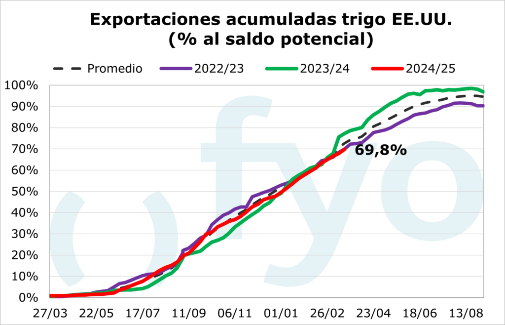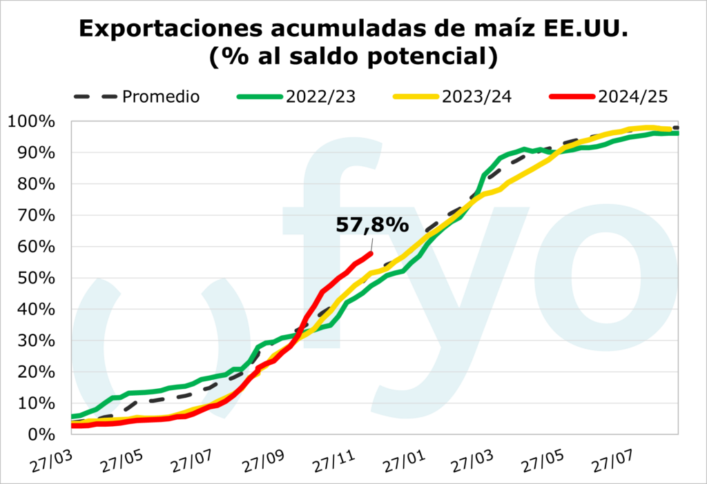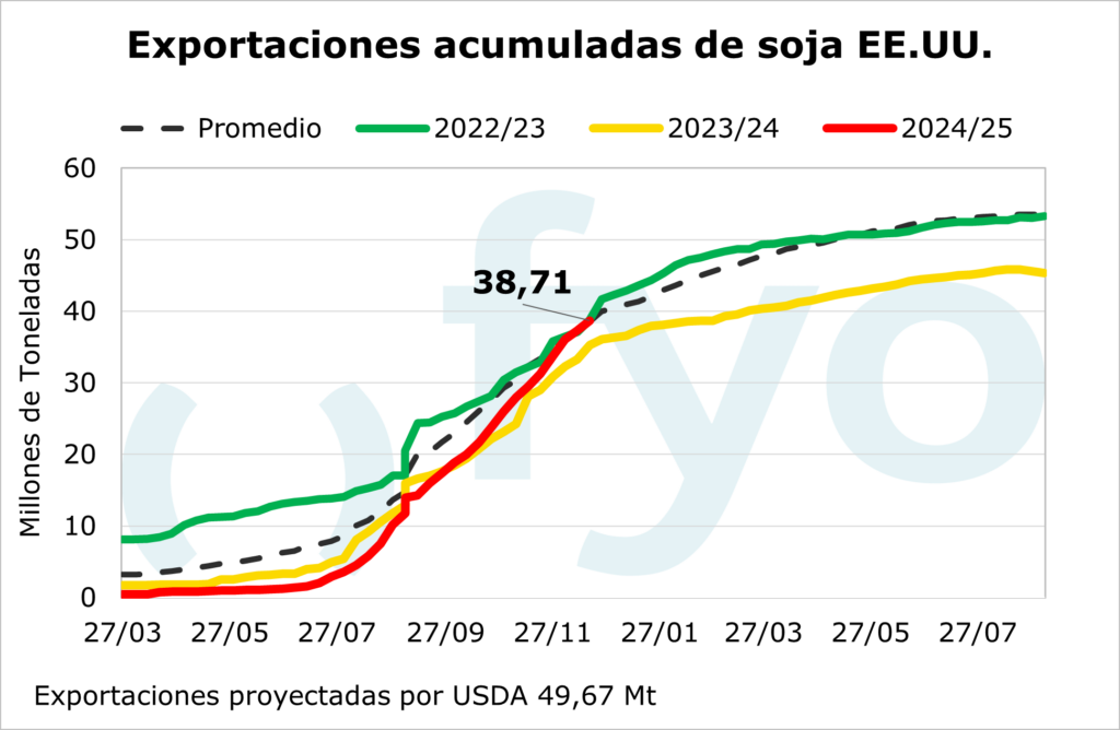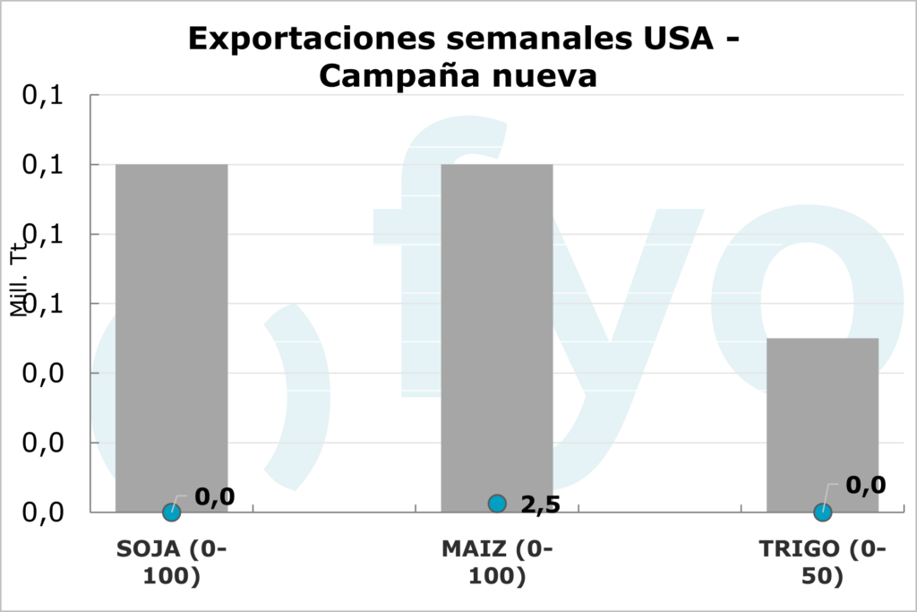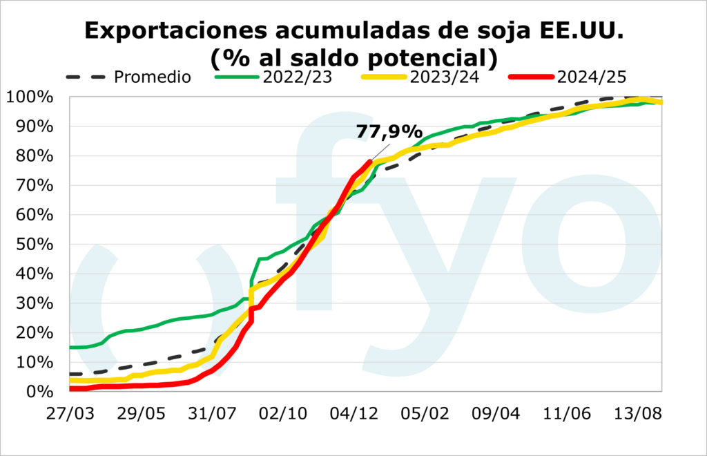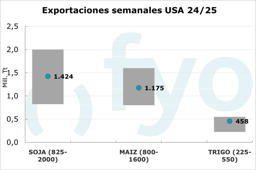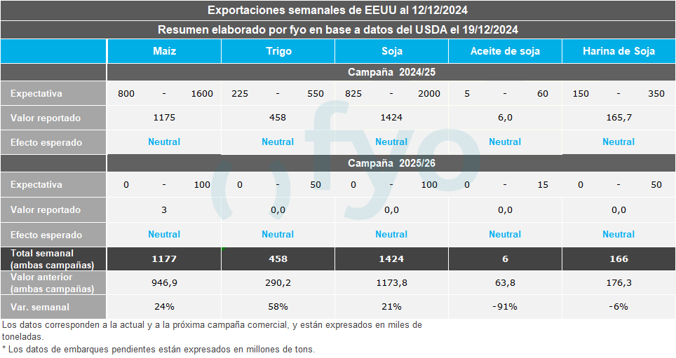 El USDA informó sobre las ventas norteamericanas a la exportación hasta el 12 de diciembre. Las ventas netas de poroto de soja fueron de 1,4 millones de toneladas, dentro de lo esperado por los analistas, aunque un volumen 21% superior a la semana previa. En cuanto al maíz, el volumen de ventas fue de 1,2 millones de toneladas, un 14% superior a la semana previa, con destino principalmente en México por 400.000 t. Respecto al trigo, las ventas netas fueron de 456.000 toneladas, a un mejor ritmo en comparación de las últimas semanas.