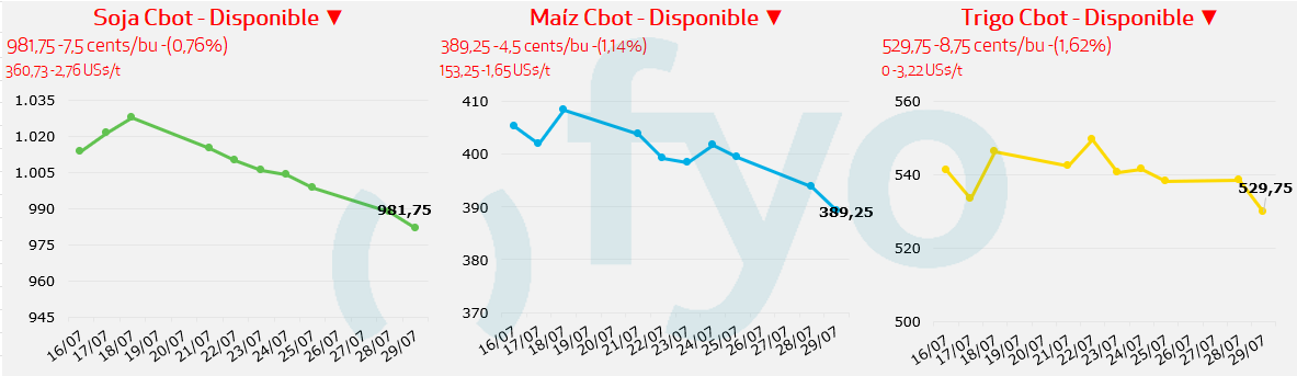 • La condición del cultivo de soja en EE. UU., calificada en un 70% como buena/excelente, por encima de la semana pasada y de lo esperado por los analistas de mercado, presiona las cotizaciones.