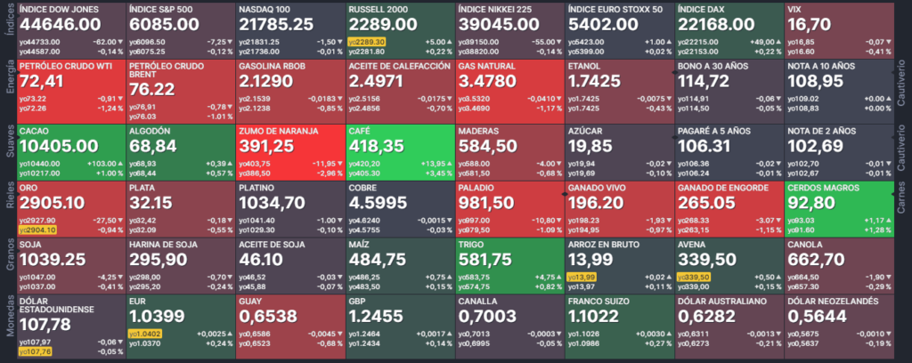 Granos maíz, trigo, soja, harina de soja, aceite de soja, cebada, arroz, trigo y canola.