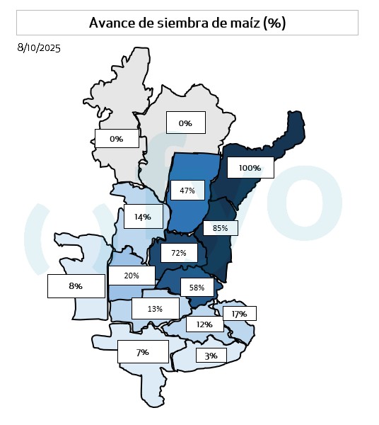 - En el centro y oeste de Buenos Aires, la siembra temprana está demorada; de no concretarse antes de mediados de octubre, la superficie se destinará a siembras tardías.