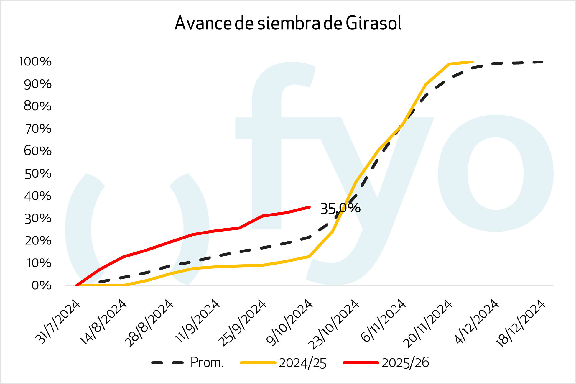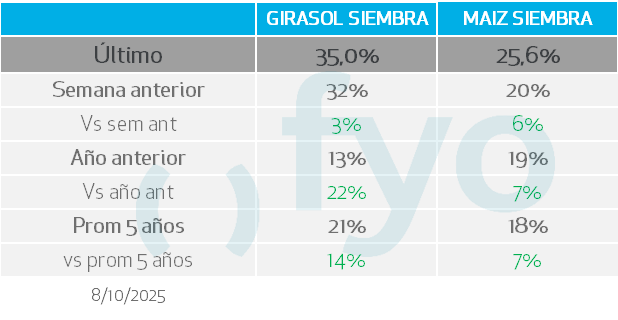 - La siembra cubre el 35 % de las 2,7 MHa proyectadas , un progreso intersemanal de 2,7 pp. Se mantiene un adelanto de 9,8 pp. respecto al ciclo previo y de 22 pp. en comparación al promedio de las últimas 5 campañas.