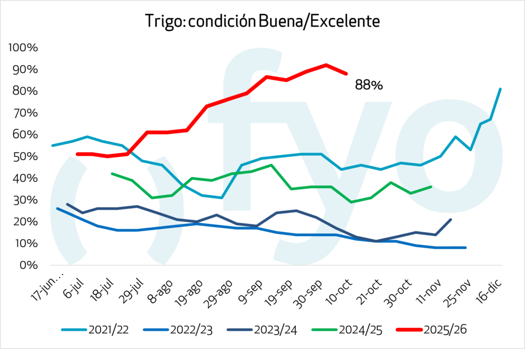 - El 88 % del área presenta una condición de cultivo Buena/Excelente , una disminución de 4 pp. respecto a la semana anterior.