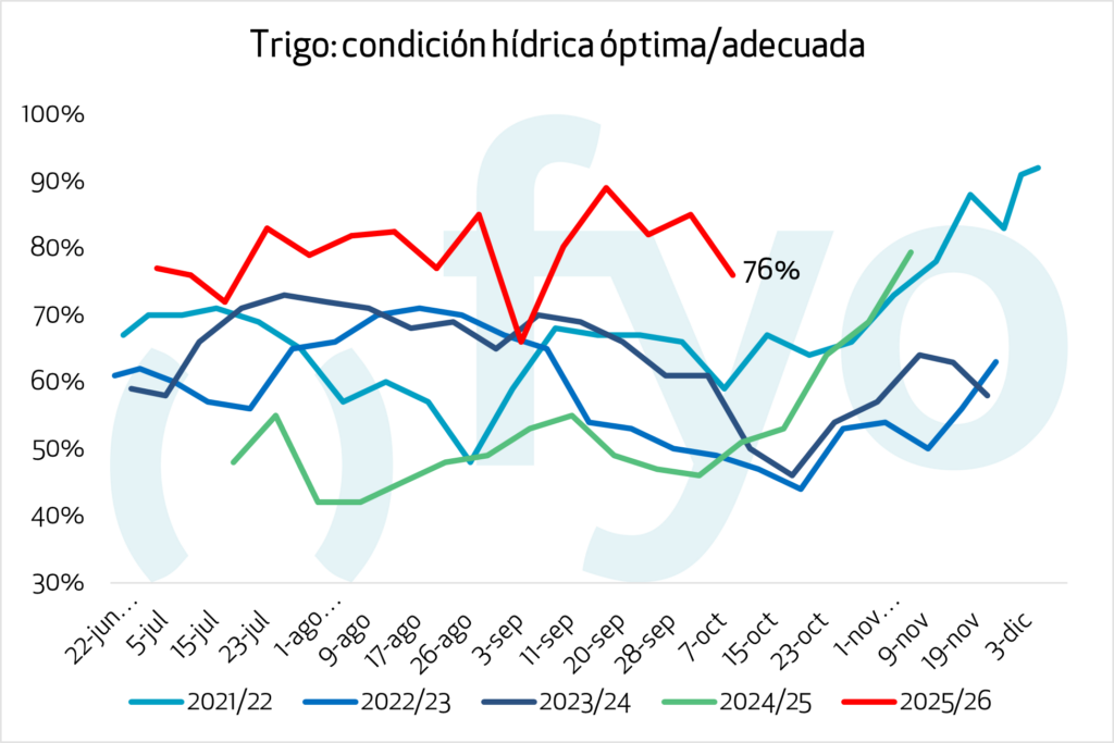 - El 76 % del área presenta una condición hídrica Óptima/Adecuada , una caída intersemanal debido a un aumento de 6 pp. en el área con excesos hídricos.