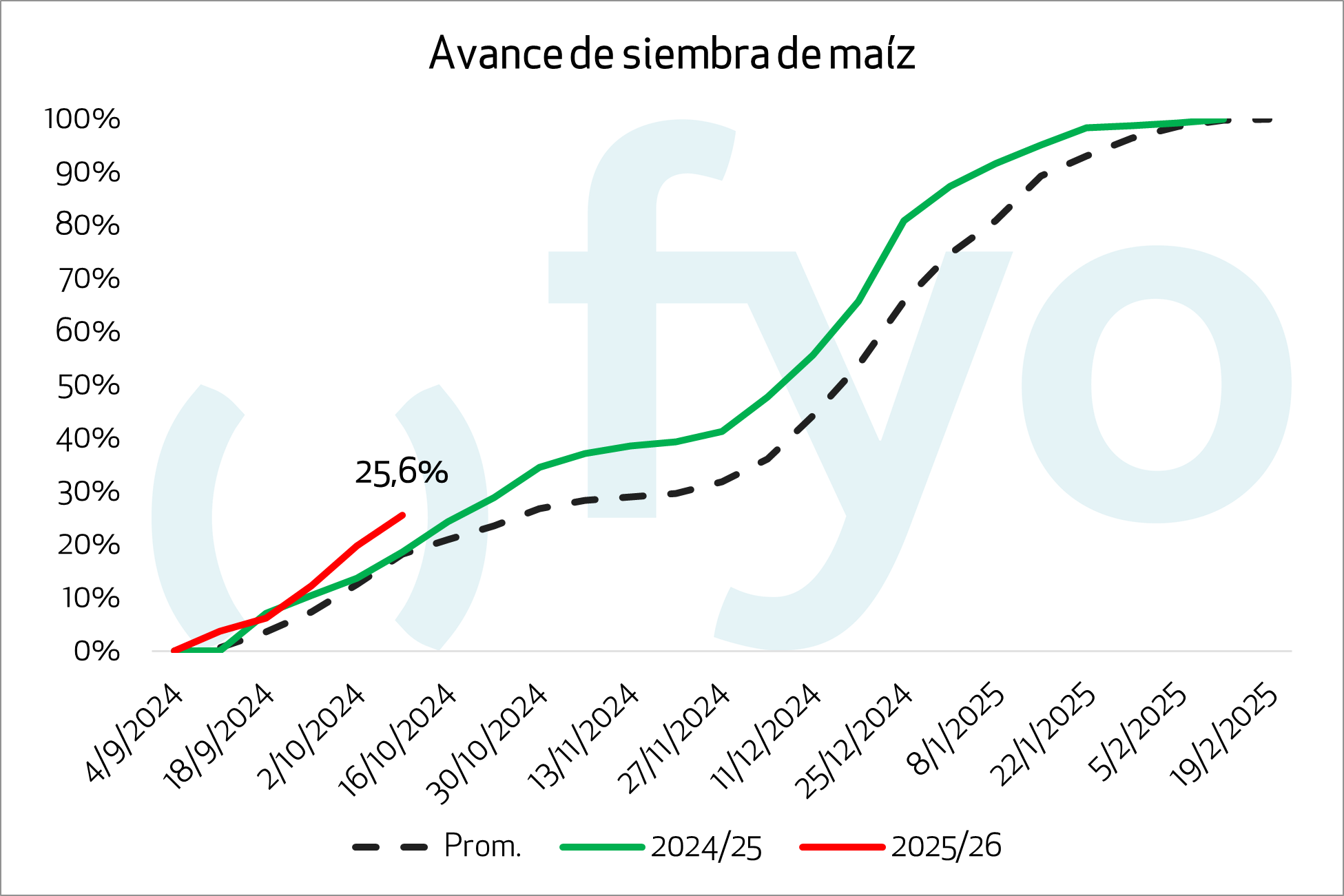 - El avance nacional de siembra es del 25,6 % , +5,8 pp. que la semana anterior , lo que representa un adelanto de 7,9 pp. frente a la campaña previa y el segundo mayor ritmo de avance de las últimas diez campañas.