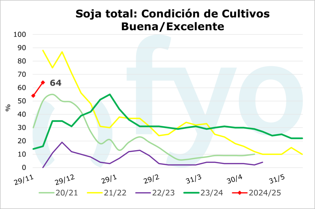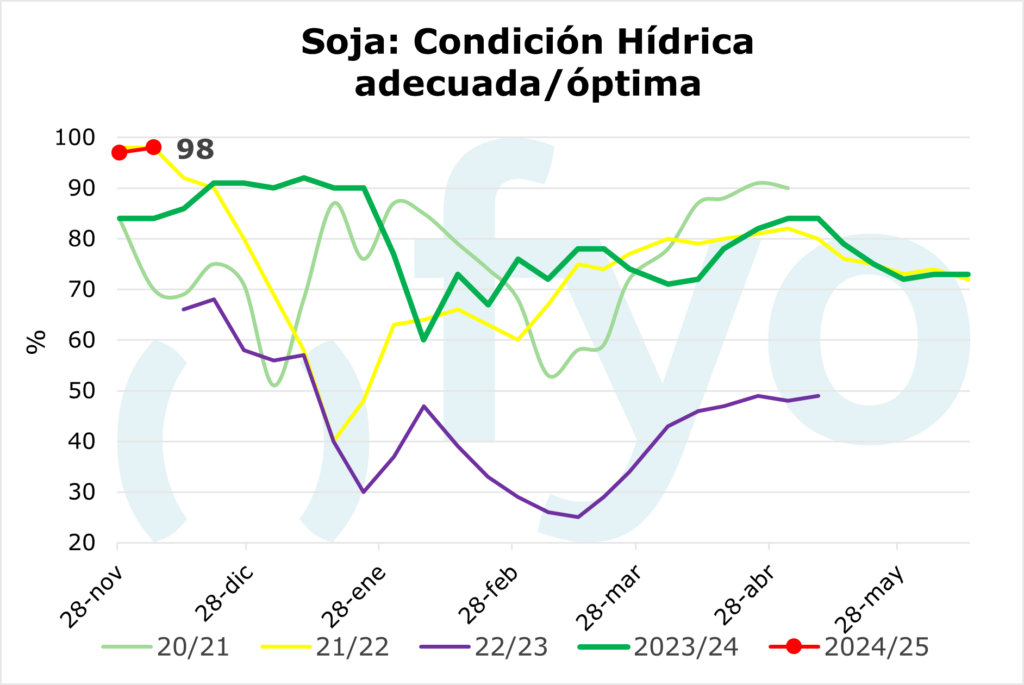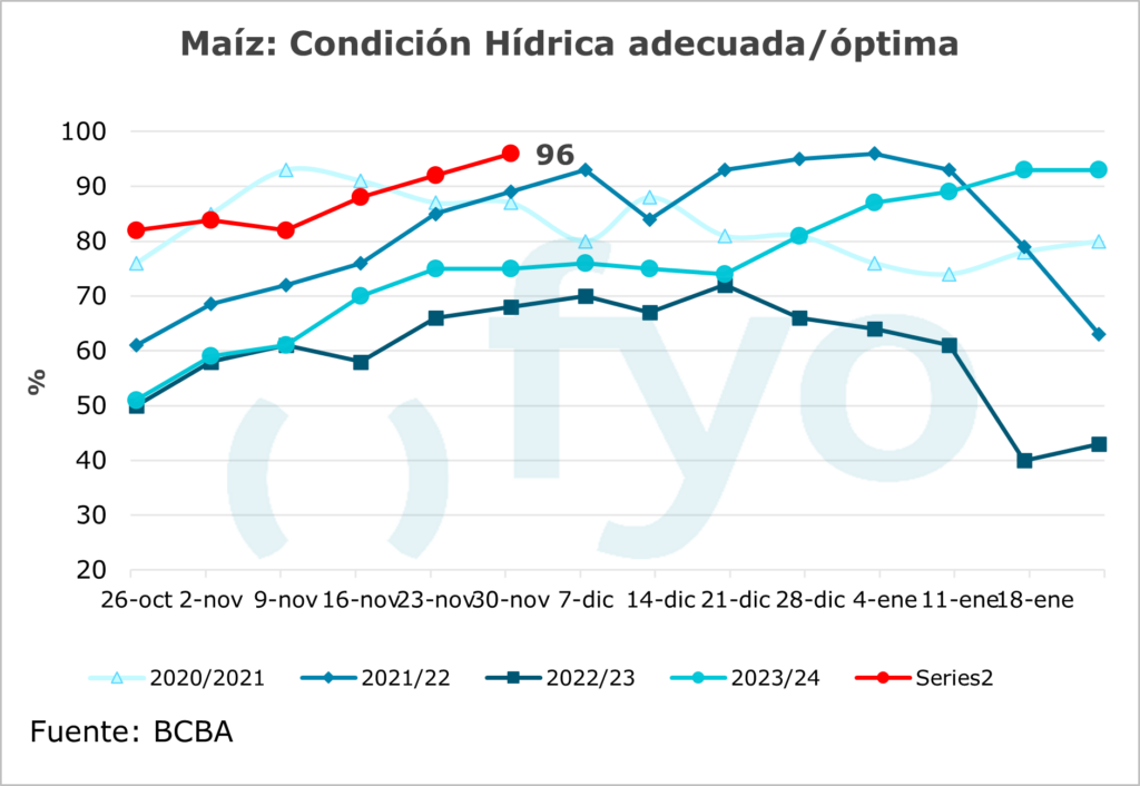 - La continuidad de las lluvias mantiene una óptima oferta de humedad en el perfil, sosteniendo e incluso mejorando la condición del cultivo en toda el área agrícola, pero con mayor potencial en los lotes sembrados tarde
