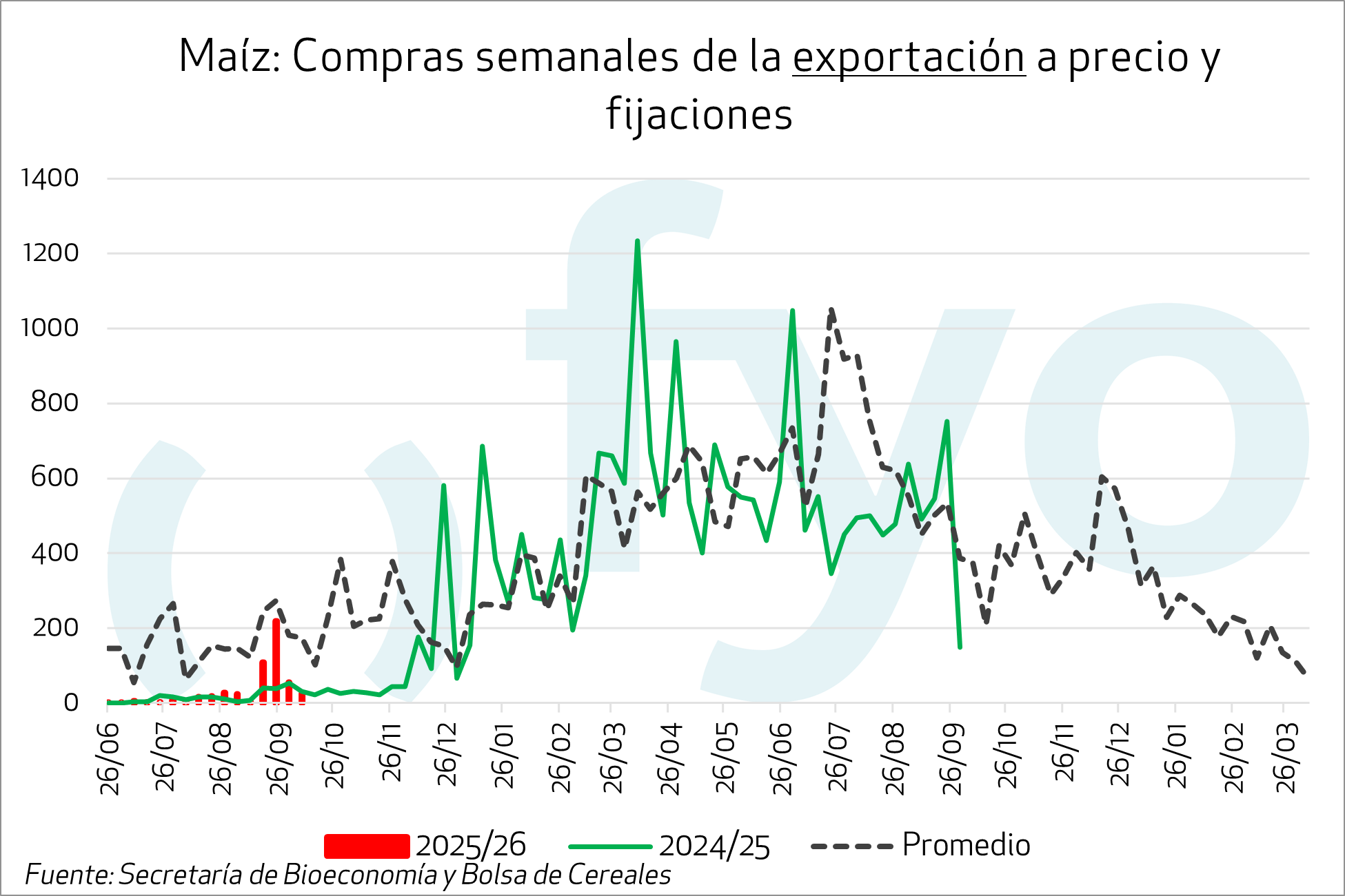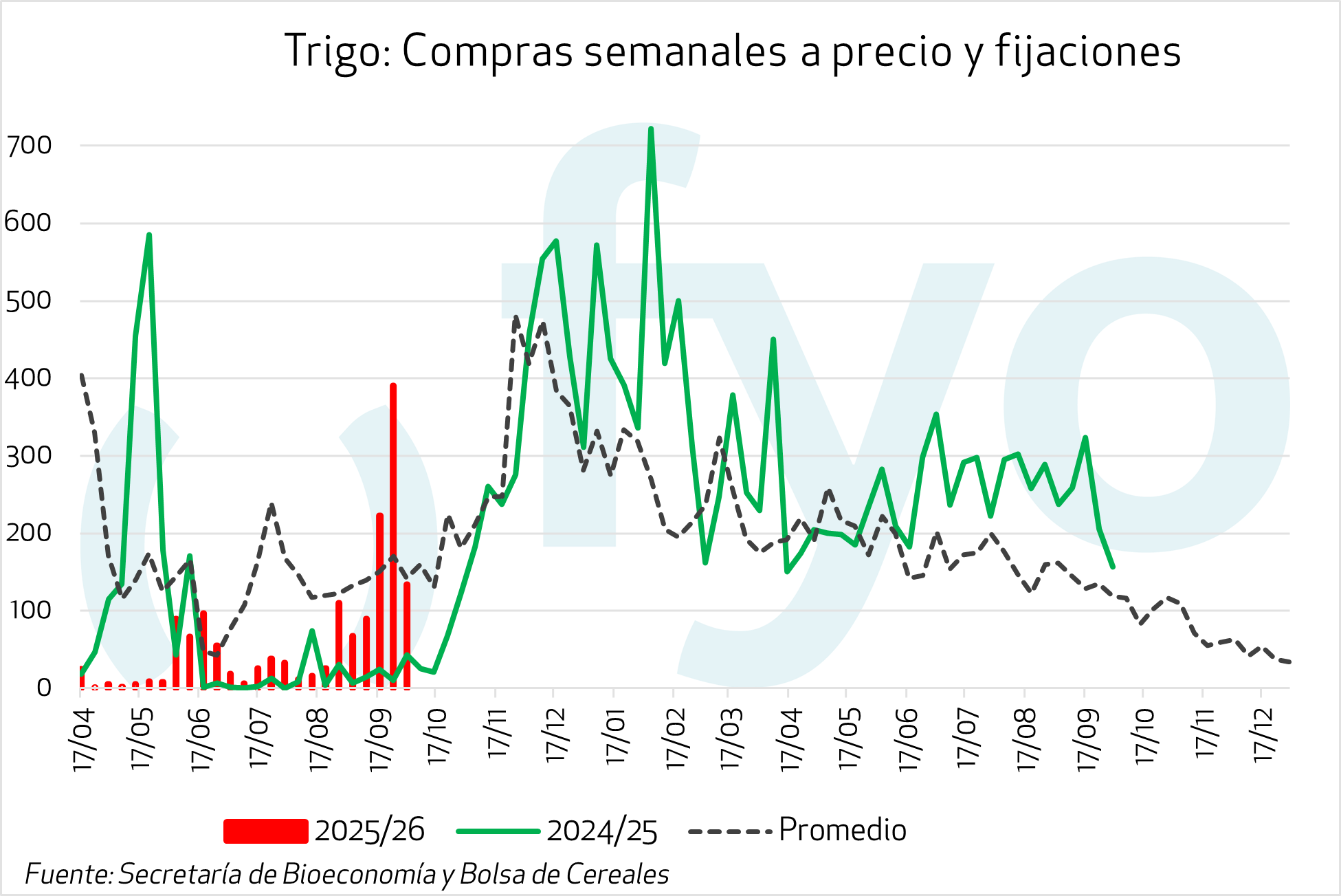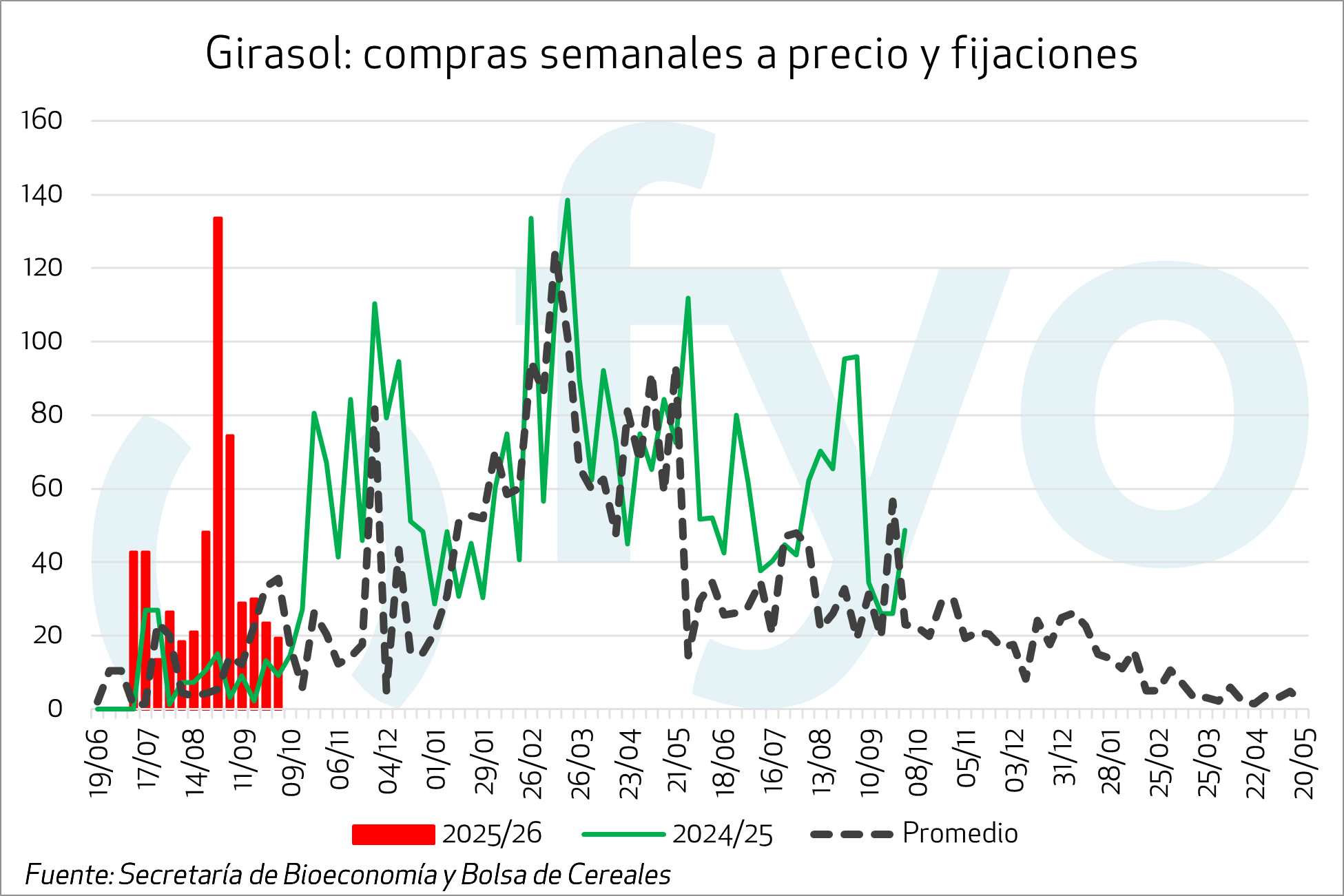 Se negociaron con precio 1,46 Mt de soja de la campaña 2024/25 y 678.000 tt. de soja de la 2025/26. El volumen acumulado de la campaña vieja alcanza al 65% de la producción, 12 pp. por encima de los promedios. De la nueva campaña, ya acumulan 1,93 Mt con precio puesto, el 4% de la producción, y un punto porcentual por encima de los promedios a la fecha.