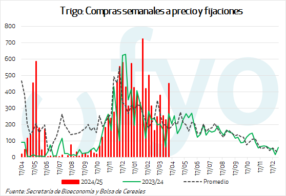 Por el lado del trigo, también fueron días de mejora en el volumen al que se le puso precio, con 450.000 tt. Si bien implicó casi el doble que la semana anterior, las cantidades a las que se le puso precio no alcanzaron la semanas de mayor volumen en plena cosecha.
