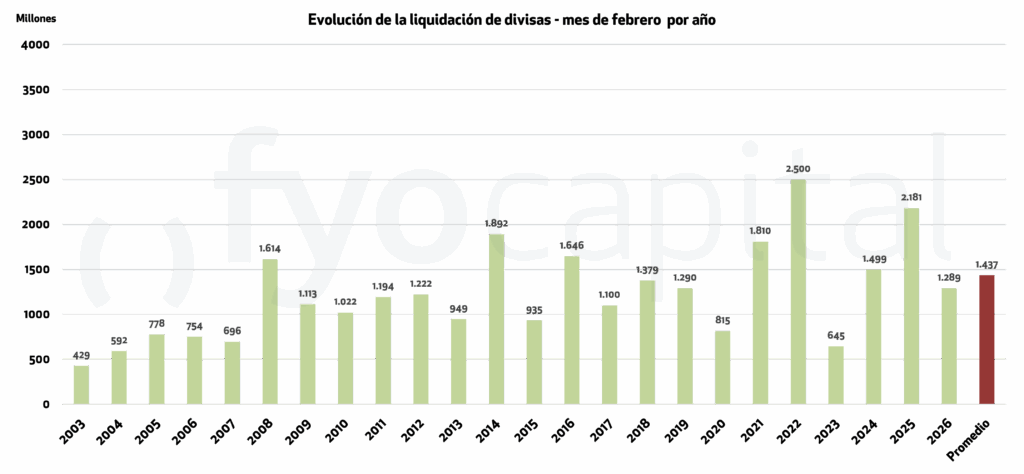 Como dato más actual del mercado de cambios, sabemos que durante febrero las empresas del sector agro liquidaron la suma de 1.289 millones de dólares, lo que representa un 30% menos con relación al mes de enero de 2026 y un 41% menos que en febrero de 2025. Esta reducción de las cantidades liquidadas se explica en parte por la cantidad reducida de días hábiles que tuvo febrero (15 días en total) debido a la combinación de feriados nacionales y a los paros de aceiteros durante la discusión de la reforma laboral. Además, debemos destacar que es un mes en el cual por estacionalidad suelen reducirse las liquidaciones.
