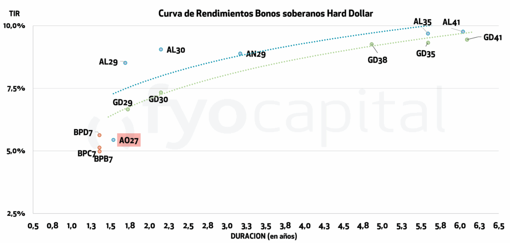 Su rendimiento lo sitúa más cerca de las TIR de los bopreales (todos cotizando entre 5% y 6%) que de los otros bonares, aún cuando tiene una duration de 1,35 al igual que el AL29. Esta alta demanda por el bono se da en el marco de una compresión de las tasas que pagan las obligaciones negociables al mismo plazo. Además, el aliciente de cobrar el bono previo a las elecciones presidenciales da seguridad a los inversores. Además, al haberse emitido sólo 250 millones de dólares, en comparación a un valor flotante de 1.115 millones del AL29, existe una prima por escasez del bono.