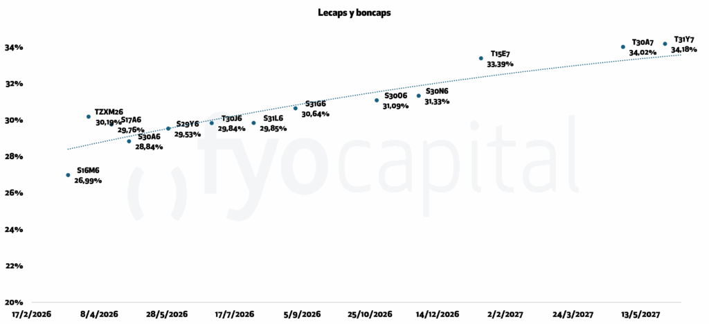 En esta ocasión no ofrecieron bonos a tasa fija en pesos, sino que ambos estaban indexados. La falta de instrumentos tasa fija en la licitación llevó a que varios agentes institucionales que necesitan instrumentos de corto plazo estables (FCI, bancos) busquen las lecaps más cercanas. Esto dió paso a una compresión de las tasas de alrededor del 4%, especialmente en la S16M6 que pasó de 34,4% el lunes a 30% el viernes.