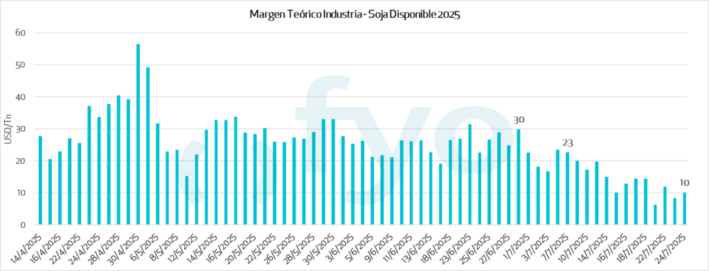 No sería correcto esperar que la mejora en capacidad de pago sea trasladada en su totalidad a precios. Partiendo de valores FOB del viernes, la capacidad teórica de pago por soja es de USD 305, es esperable que las fábricas busquen conservar algo de margen, que osciló entre los USD 20 y USD 30 durante la vigencia del esquema anterior. En este marco, si esperamos márgenes entre USD 15 y USD 20, podríamos espera un precio de la soja en la zona de los USD 285 – USD 290.