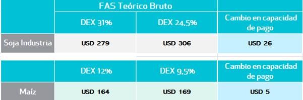 Aplicando esto a los valores FOB de cada producto, implican una mejora en las capacidades de pago por soja de USD26 por tonelada y USD5 en maíz.