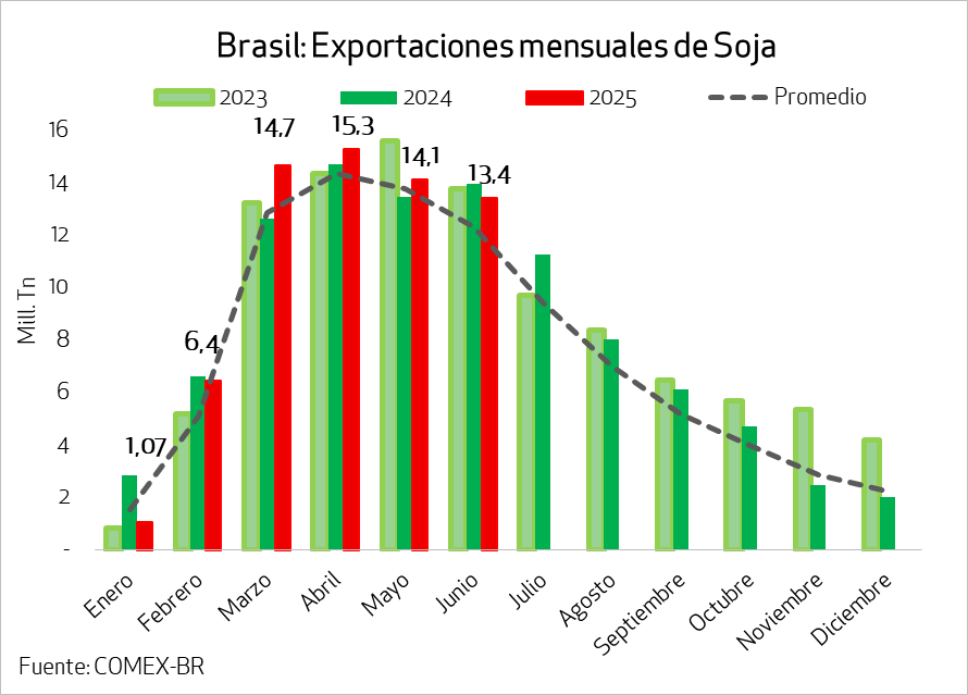 China continúa comprando a Brasil, quien se encamina a un julio en 12 millones de toneladas según estimaciones de la Asociación Nacional de Exportadores de Cereales de Brasil (ANEC), volumen que superaría el promedio de exportaciones alcanzado las últimas campañas.