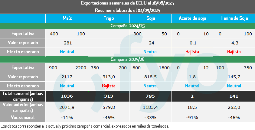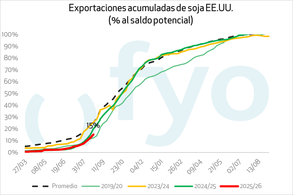 Las ventas de soja 25/26 fueron 818.500 Toneladas, mayoritariamente registradas con “destinos desconocidos”. Las ventas acumuladas alcanzan 7,2 Mt, 6,9 Mt por debajo del promedio para la fecha. Si bien la ausencia de la demanda China es evidente, cabe destacar que los demás destinos continúan mostrando una excelente performance, si bien resulta insuficiente para compensar la falta de compras del gigante asiático.