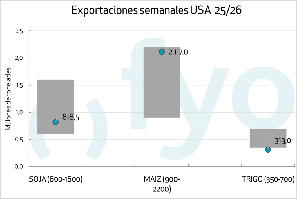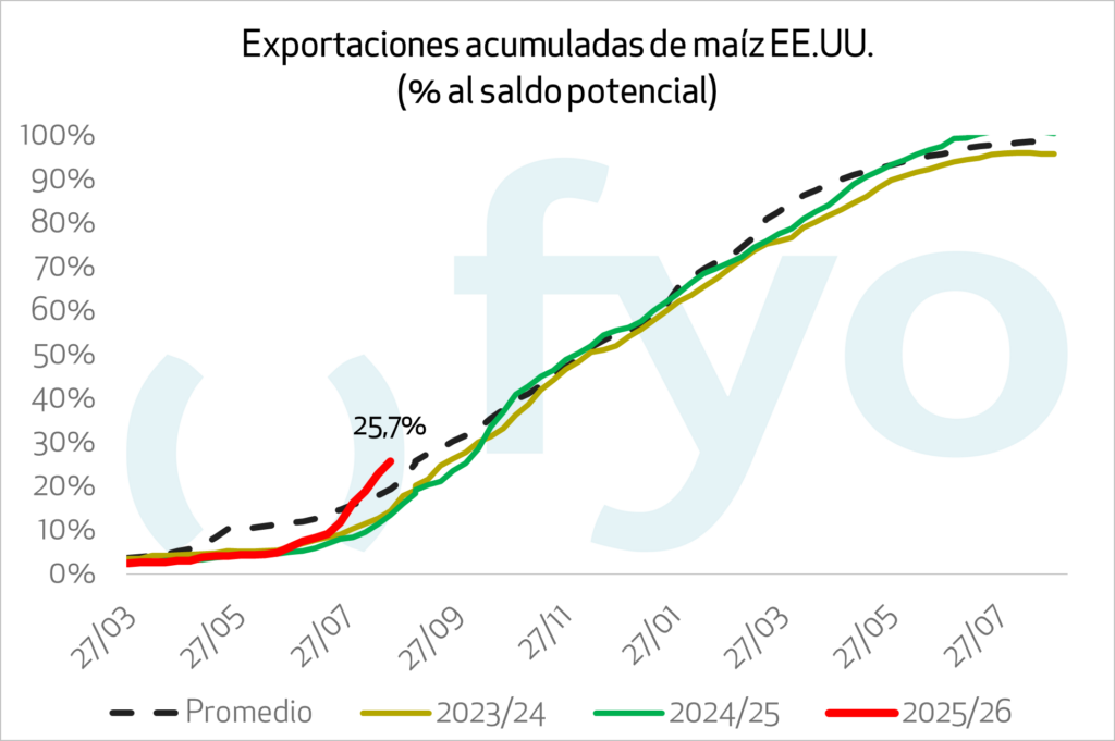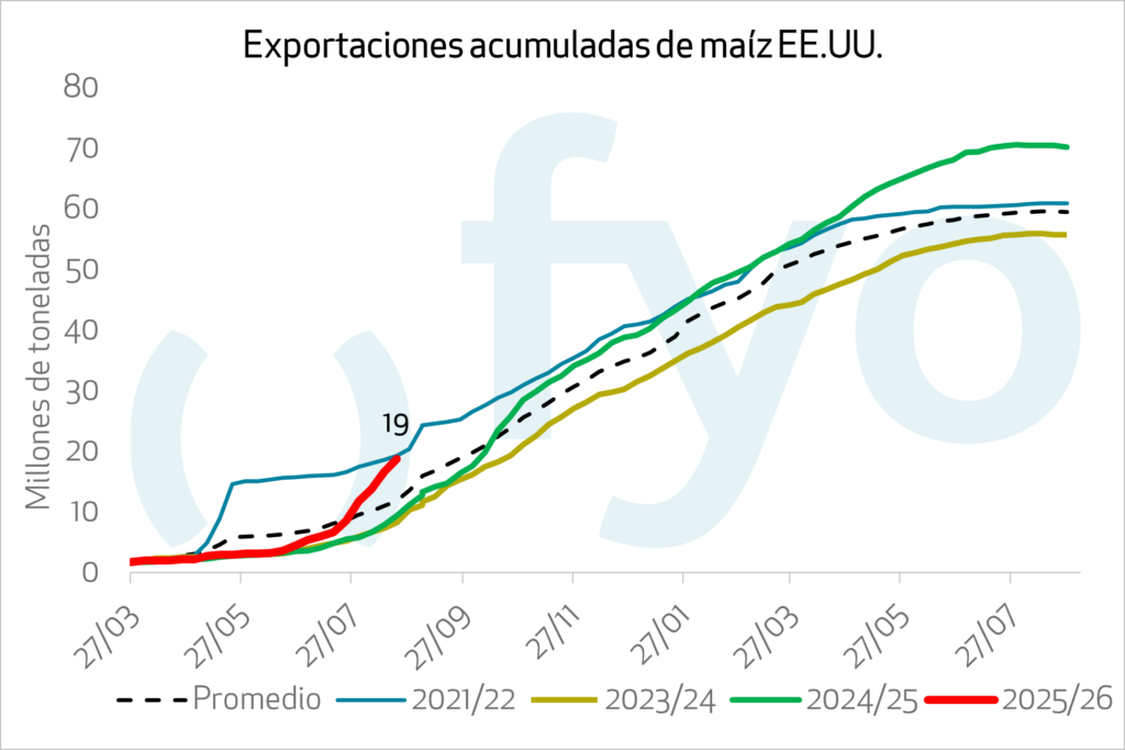 Las ventas de maíz 25/26 fueron 2,1 Mt. De esta forma, las ventas acumuladas de la nueva campaña ya alcanzan 18Mt, 6Mt arriba del promedio para la fecha, manteniéndose México como principal destino.