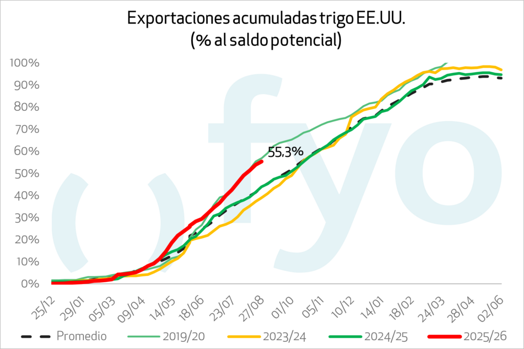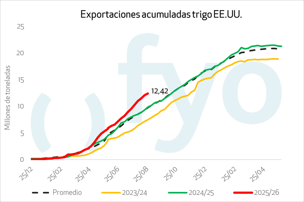 Las ventas netas de 313.000 toneladas para 2025/2026 disminuyeron un 46% desde la semana anterior. De esta forma las ventas de trigo de la campaña acumulan 12 Mt, superando en 2,6 Mt el promedio de ventas de campañas anteriores para la fecha. El destino principal continuó siendo México (208.600 Tn).