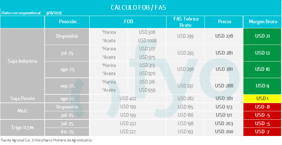En el caso de la posición fábrica se parte de los precios FOB de los subproductos, luego se les aplica al valor del aceite, el porcentaje de rendimiento del poroto de soja para la extracción del mismo, y lo mismo en harina. Se suman estos valores, y se descuenta el costo de molienda estimado. El resultante es la capacidad teórica de la fábrica.