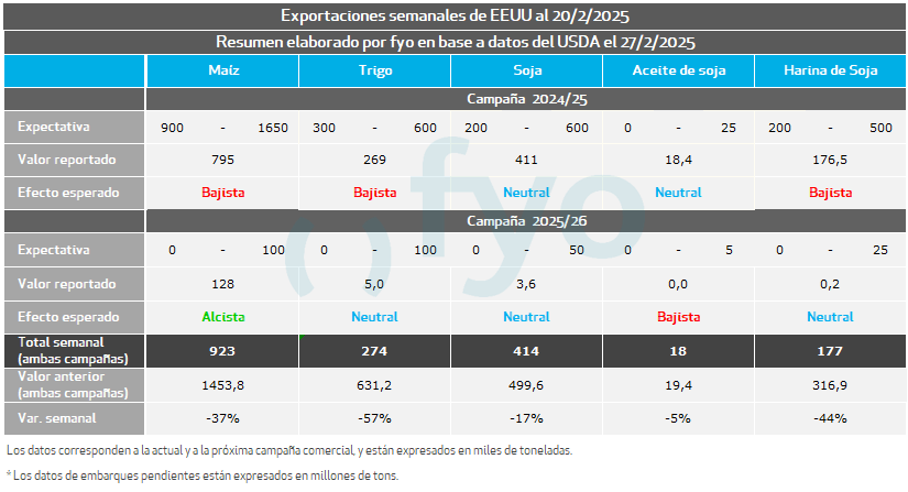 Exceptuando las ventas de soja que para la semana finalizada el 20/2 lograron acumular 411.000 Tn dentro del rango esperado por el mercado, las ventas semanales de maíz y trigo se ubicaron por debajo de lo esperado por el mercado.