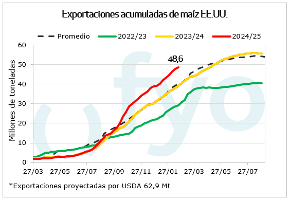 En maíz las ventas semanales alcanzaron solo las 795.000 Tn siendo el menor volumen de las ultimas 7 semanas, resultando además inferior a lo registrado la misma semana de la campaña anterior. Las mayores ventas continúan siendo a México.