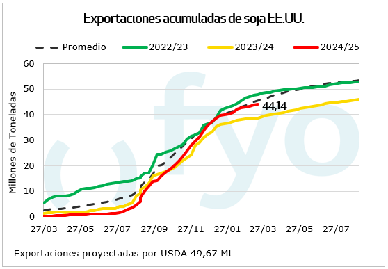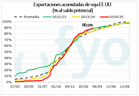 Las compras semanales de soja norteamericana de China fueron 75.000 Tn, acumulando compromisos totales a 21 Mt frente a los 22,1 Mt registrados para la fecha el año pasado. Por último, las ventas de harina de soja fueron inferiores a lo esperado cayendo a mínimos de 6 semanas mientras que en aceite superaron las expectativas.