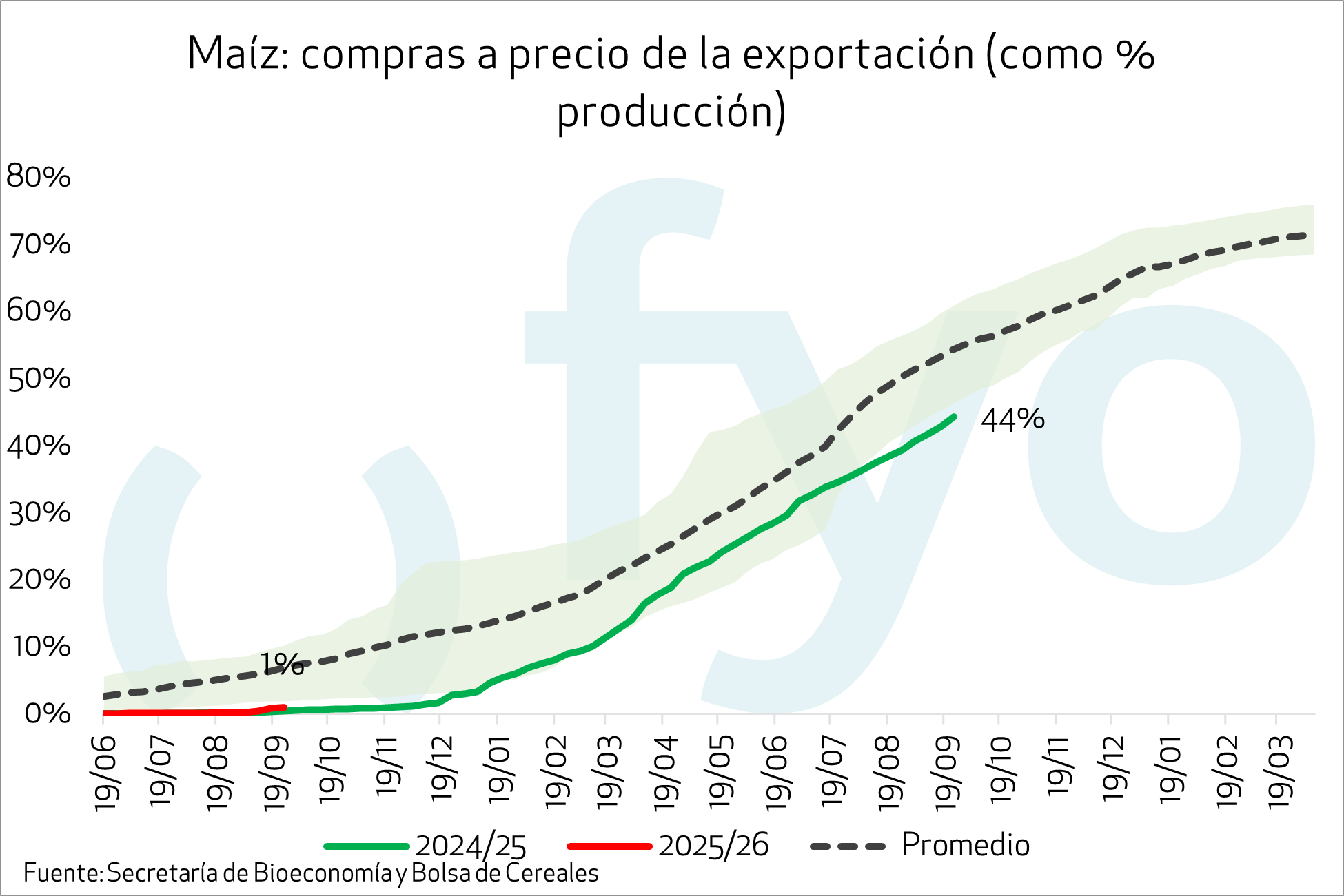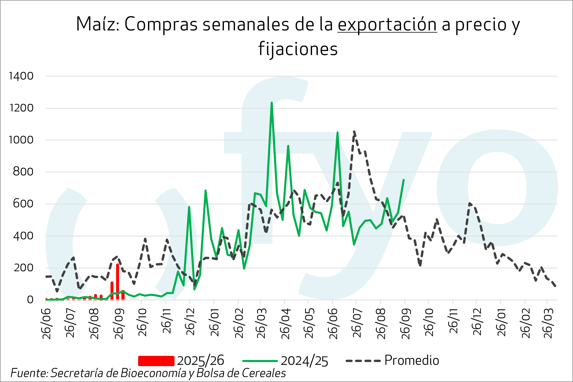 En cuanto al maíz, el volumen negociado aumentó marginalmente, por unas 750.000 t (vs 545.000 de la semana previa), esto implica que sólo el 50% de la producción 2024/25 tiene precio (vs 58% promedio).