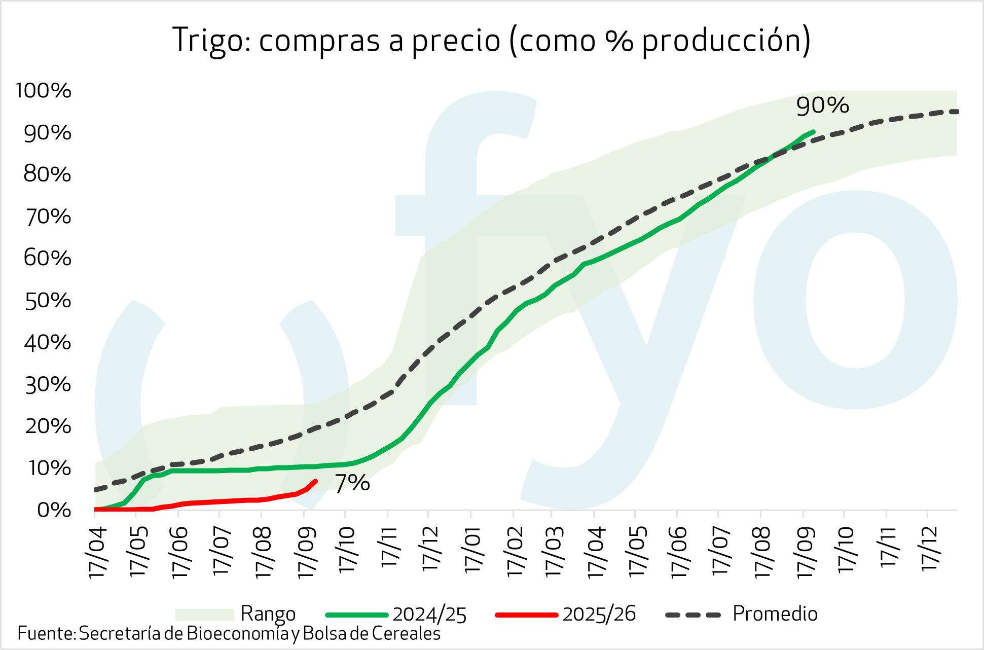 En cuanto al trigo, tuvimos mayores cantidades vendidas para la nueva campaña que para la disponible (391.000 t vs 206.000 t). A pesar de esto, todavía el trigo con precio representa sólo el 7% de una producción con precio, por debajo del promedio de 18% para esta altura del año.