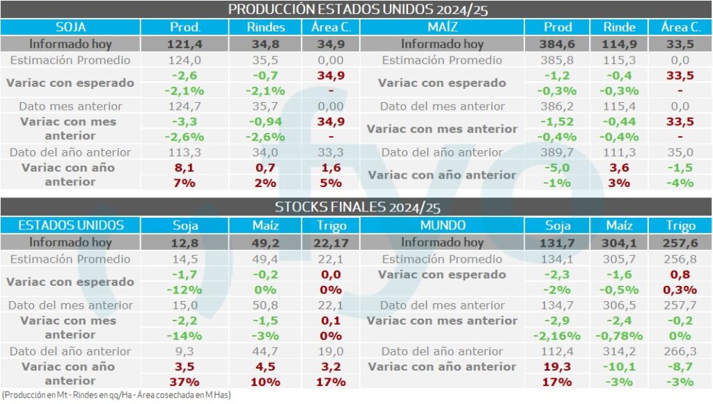 En soja se dio un recorte en la estimación de producción 2024/25 por 3 Mt en los Estados Unidos, motivado por menores rendimientos (de 35,7 qq/ha a 34,8 qq/ha). Para Brasil y Argentina, se mantienen las proyecciones, en 169 y 51 Mt respectivamente.
