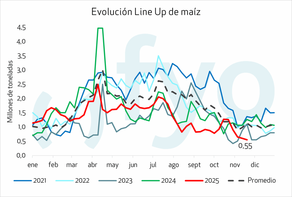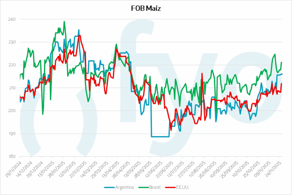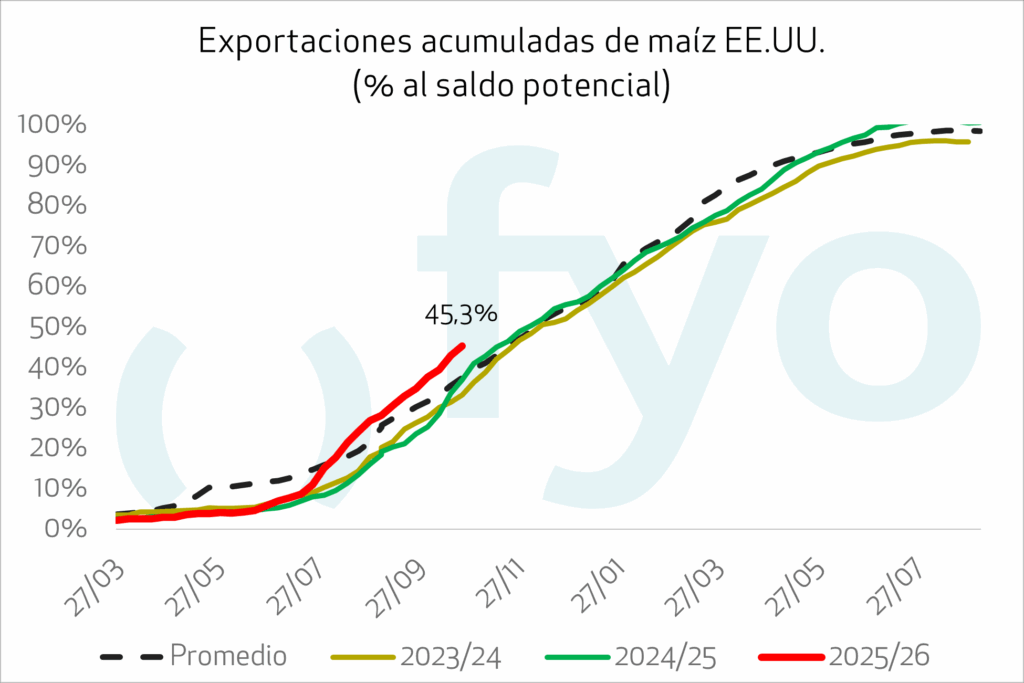 Respecto al maíz, las ventas de exportación estadounidenses mantienen su firmeza, impulsadas por la competitividad de sus precios FOB. En la información publicada hasta el 23 de octubre, EE.UU. llevaba vendidas 35 millones de campaña 2025/26, un 37% por encima de lo que llevaba vendido a la misma altura del año pasado.