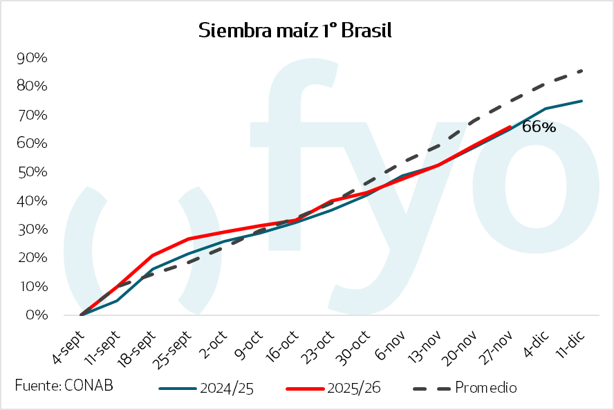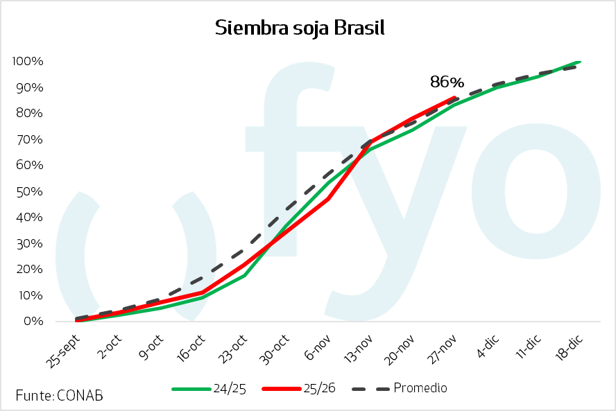 Fuera de la demanda en los EE.UU., el otro foco del mercado es lo que está sucediendo en Brasil La siembra de soja alcanzó el 86%, favorecida por la regularización de las lluvias que impulsó el avance y un buen desarrollo vegetativo en el centro y norte del país; estados como Mato Grosso y Bahía están próximos a finalizar. En contraste, la región sur enfrenta un escenario delicado: Rio Grande do Sul sufre retrasos y deterioro de cultivos por déficit hídrico, mientras que en Paraná la falta de agua ha obstaculizado labores.