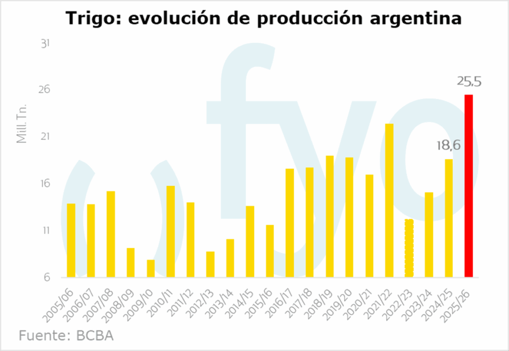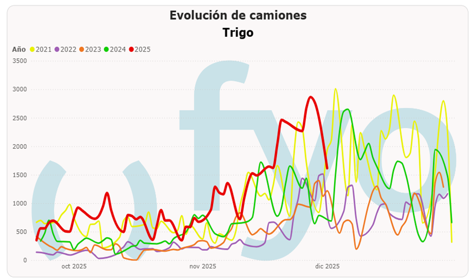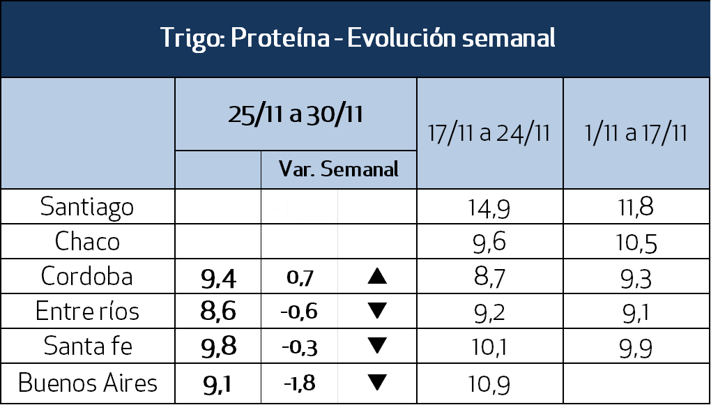 En el plano local, el mercado se encuentra bajo plena presión de cosecha de trigo. Se estima una producción récord de 25,5 Mt según la Bolsa de Cereales de Buenos Aires, con las labores en la zona centro avanzando en torno al 50%. La cosecha se extendió decisivamente la semana pasada sobre núcleo norte, sur de Córdoba y Entre Ríos, y esta semana avanzaría ya sobre el núcleo sur. Las calidades relevadas siguieron cayendo en Santa Fe y Entre Ríos, pero mejoró en Córdoba con la entrada de la cosecha del sur de la provincia.