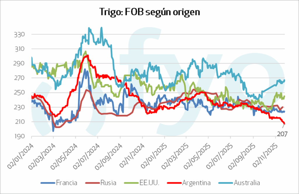 En el mercado global de trigo continúa pensando la amplia oferta. La atención se centra en las producciones récord de Argentina y Australia, aunque ambos orígenes presentan problemas de calidad. En este contexto, el trigo argentino profundiza su competitividad en el mercado FOB.