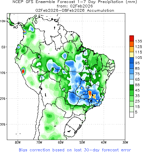 - StoneX ajustó al alza sus previsiones de producción para Brasil, estimando la primera cosecha en 26,59 Mt (+600.000 t) y la safrinha en 106,37 Mt (+550.000 t), superando sus previsiones anteriores.