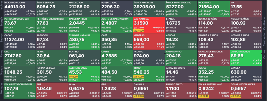 Energía petrólo WTI, gas oil con ultra bajo contenido de azufe (ULSD), nafta, gas natural, petróleo Brent y etanol.