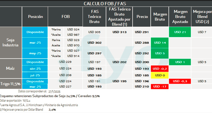 En el caso de la posición fábrica se parte de los precios FOB de los subproductos, luego se les aplica al valor del aceite, el porcentaje de rendimiento del poroto de soja para la extracción del mismo, y lo mismo en harina. Se suman estos valores, y se descuenta el costo de molienda estimado. El resultante es la capacidad teórica de la fábrica.